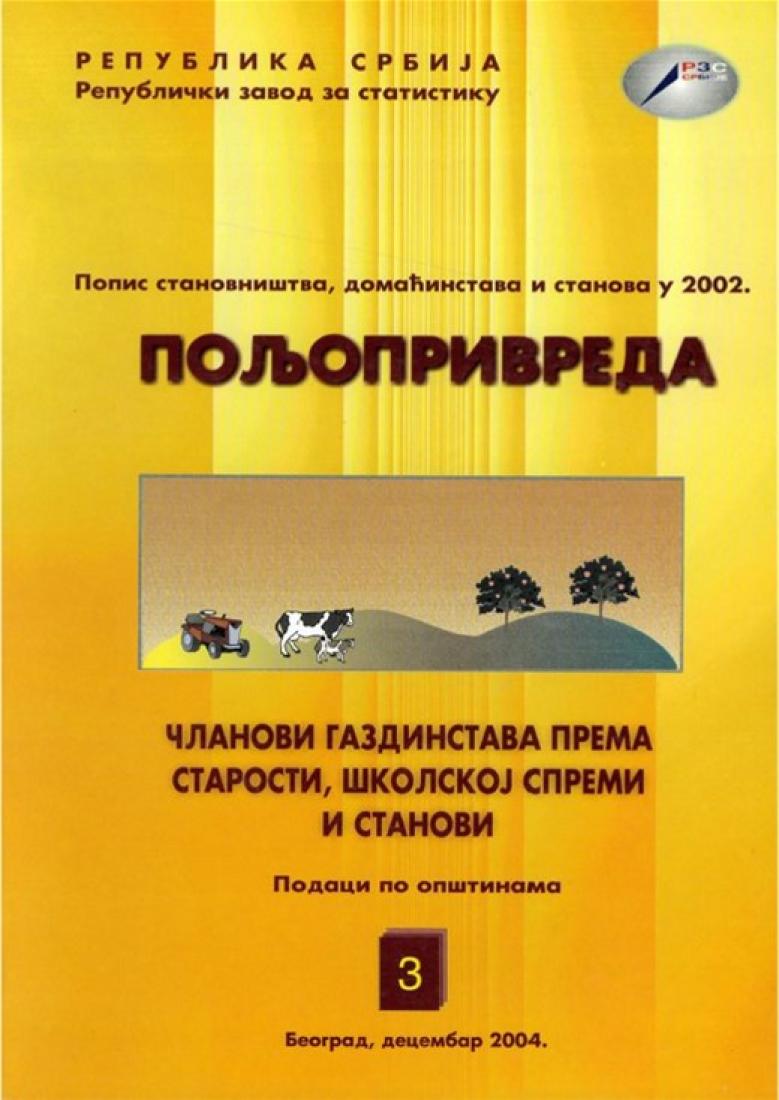 Census of Population, Households and Apartments in 2002: Agriculture; Household Members by Age, School Age and Housing Попис становништва, домаhинстава и станова у 2002 : польопривреда; чланови газдинстава према старости, школскоj спреми и станови-