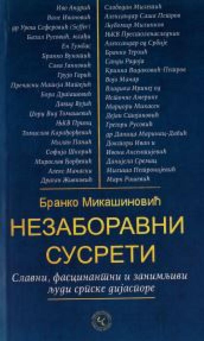 - Unforgettable Encounters: Famous, Fascinating and Interesting People of the Serbian Diaspora The Belgrade publisher "Čigoja štampa" published a translation from English by the American anthologist of Serbian origin, Slavist and journalist, Branko Mikašinović: "Unforgettable encounters - famous, fascinating and ordinary people of the Serbian diaspora". This book is a recollection of Mikašinović's meetings and conversations with personalities of the Serbian diaspora over the past fifty years. The range of personalities represented is diverse and therein lies the appeal of this book: various personalities, circumstances, observations and conclusions. American literary critic Martin Dean wrote about this book: "Mikašinović takes us to the era when young intellectuals gathered in bookstores and cafes to discuss the latest literary bestsellers." Other places of such meetings were famous restaurants, hotels and gatherings where something of the unique and nostalgic elegance of the 19th century has been preserved.